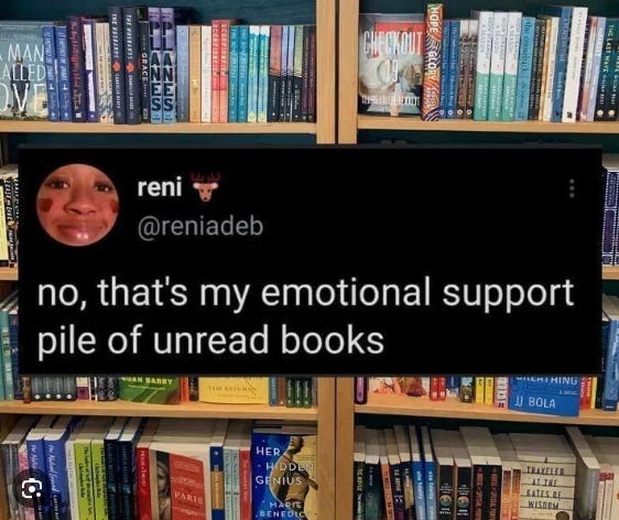 I always joke that my "To Be Read ( TBR) " stack will outlive me. I always lament about the sheer number of books that I want to read vs. the actual amount of time that I have to read all the amazing books. Yet we all just keep stacking up the books we want to read, to keep us excited and inspired. Some of my favorite inspired humans have an "emotional support book stack" somewhere in their vicinity.