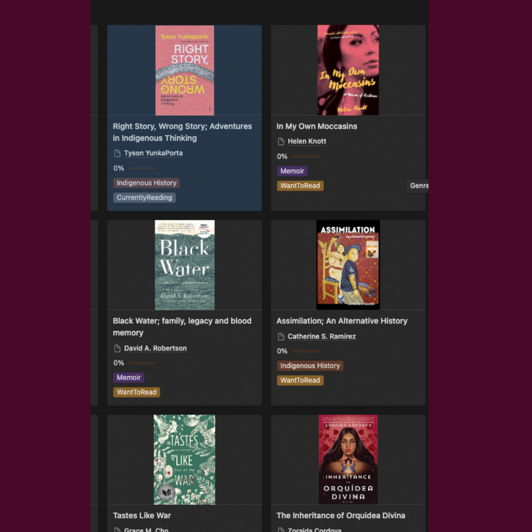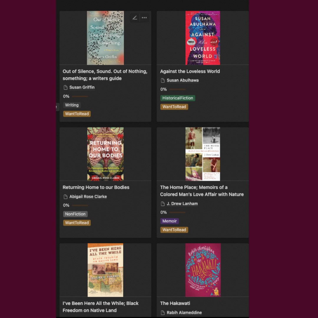 I use Notion as my Book Library Tracker. I used to use Goodreads app, but I find I don't really always care for the social and commercial element of that platform, so I have built my own book tracker in the ever-adaptable Notion platform. If anyone is interested in a full tutorial on how I build my TBR and Library in Notion, comment below!